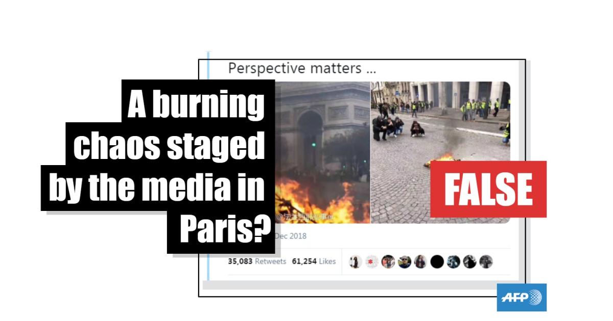 In an attempt to condemn media manipulation, Twitter user @doveywan juxtaposed two images, one of a large fire in front of the Arc de Triomphe, a Paris landmark, and another of a toy scooter on fire, surrounded by individuals capturing the seemingly inconsequential moment. The caption, "perspective matters," suggests that content-hungry journalists manipulated images and thus distorted reality. The tweet was shared more than 35,000 times.