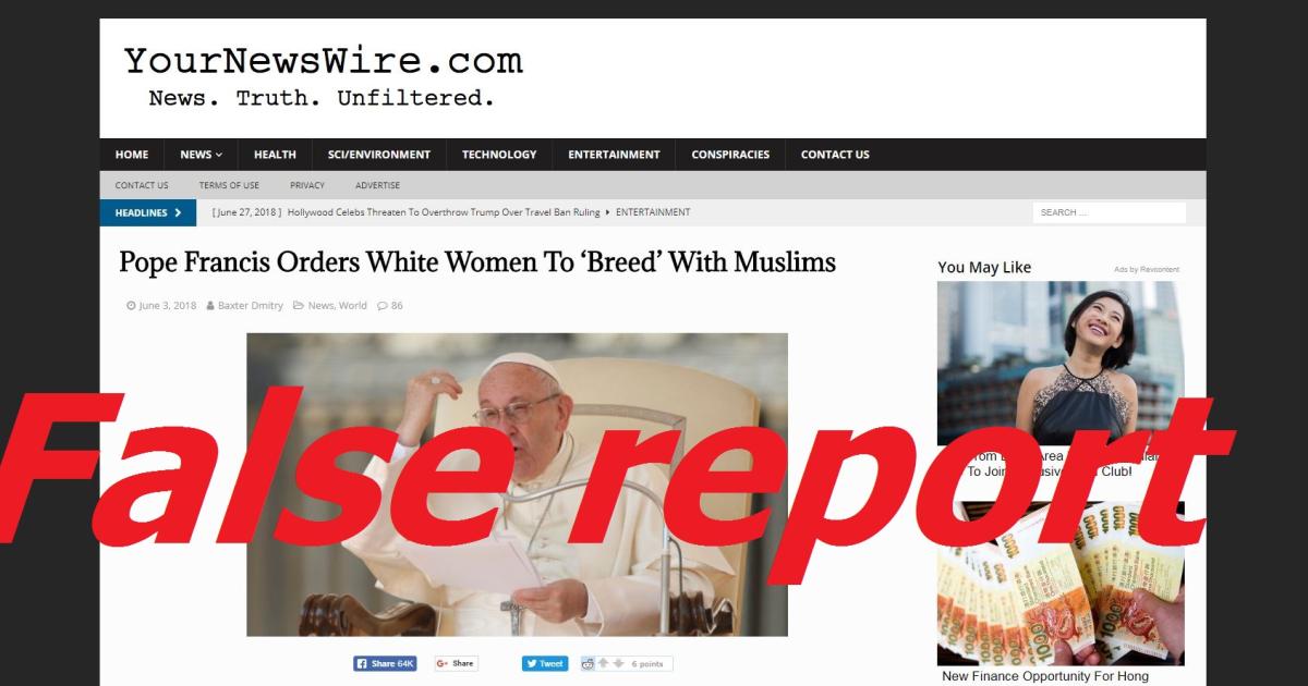 YourNewsWire.com claimed the Pope told French Catholic newspaper La Croix in a May 2016 interview that white women should “breed” with Muslims to reverse a declining birth rate in Europe.