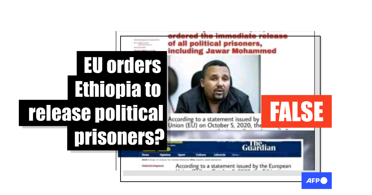 European Union Commission spokesman Daniel Puglisi told AFP Fact Check on October 23, 2020, that “in recent weeks, the European Union did not make any public statement regarding political prisoners in Ethiopia”.