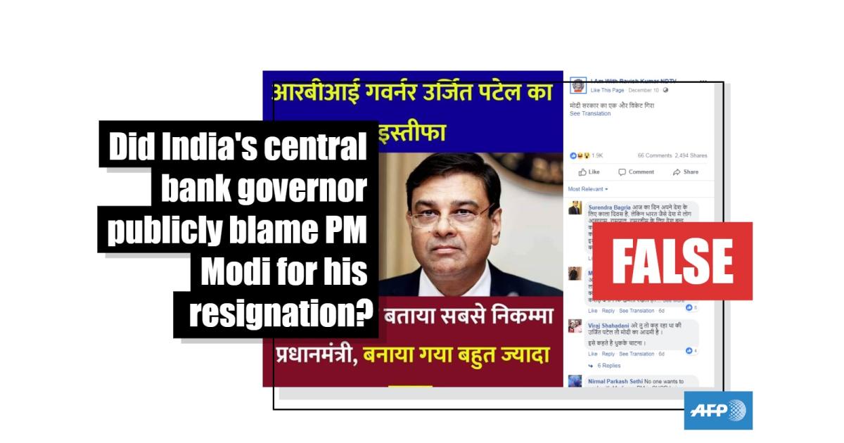 The text on the photograph of Patel says in Hindi: “The governor of the Reserve Bank of India resigns. He called Narendra Modi the most useless prime minister and said he was pressured into handing in his resignation.”