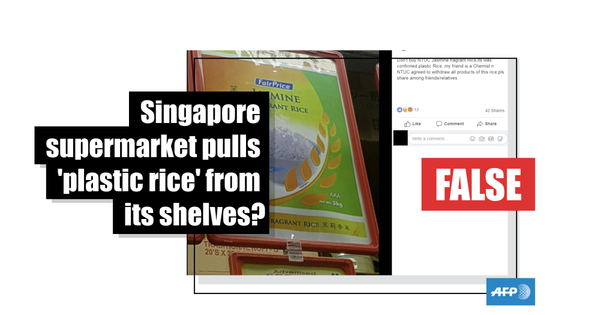 The statement says: “Dear shoppers, We’ve noticed a recent message on social media asserting that our FairPrice housebrand jasmine fragrant rice is made of plastic. This is false. We’d like to assure all our shoppers that our rice is 100% safe for consumption, and have passed stringent safety checks by the authorities. We would like to advise the public not to further circulate this malicious rumour. Thank you!”