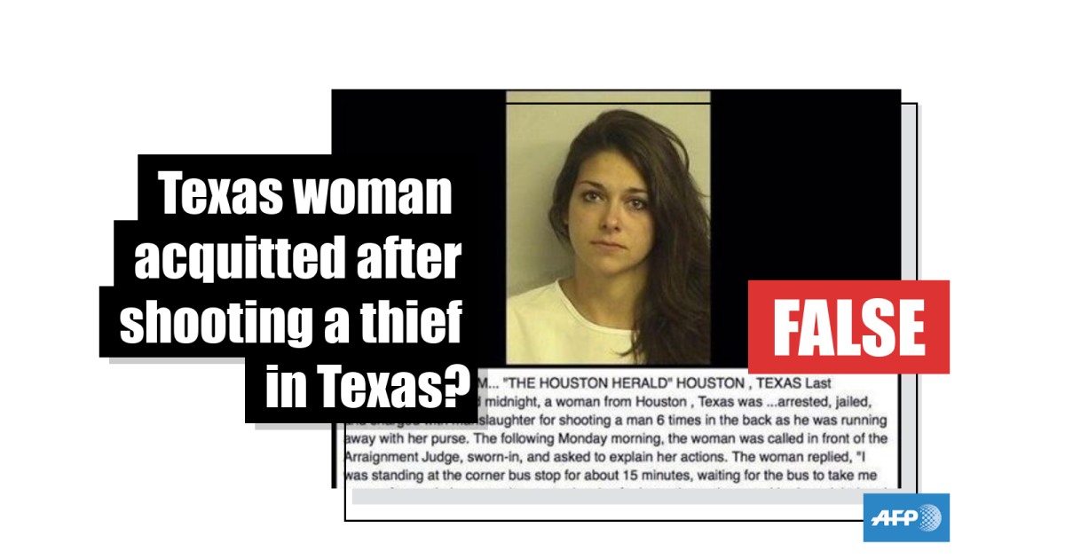 No, this story about a woman being acquitted of homicide in Texas after shooting a thief is not true