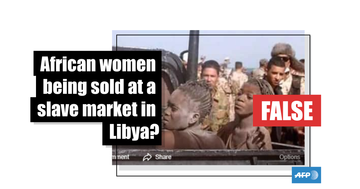 The Facebook post above, from 4 January, has clocked up more than 70,000 views. The picture shows two dust-covered women in the back of a truck, surrounded by men in army camouflage. The post uses the image to claim that African girls are suffering sexual and physical abuse at a modern-day slave market in Libya.