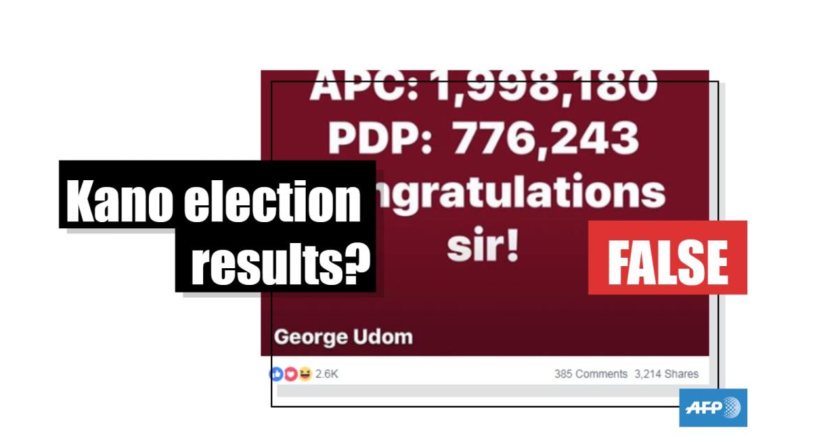 The false Facebook post, which has been shared by more than 3,200 people and which we've archived here, claims that Ganduje of the All Progressives Congress (APC) polled 1,998,180 votes while his main rival, Abba Yusuf of the Peoples Democratic Party (PDP), got 776,243 votes. The post congratulates Ganduje as the winner of the poll.