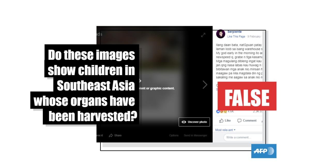 The post’s caption says in Filipino: "Hundreds of children found dead and have no more organs in a warehouse in Marikina. My god early in the morning this is what I watched in my newsfeed, the vileness of men has reached another level.