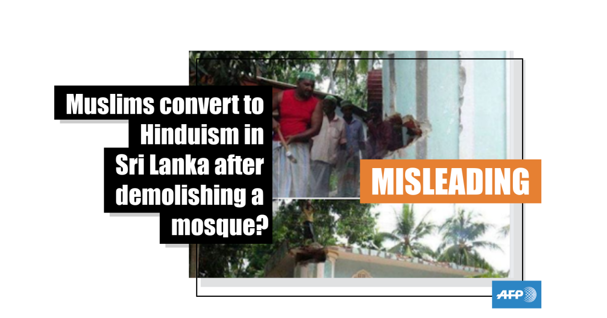 The Hindi-language caption translates into English as: “In Sri Lanka, Muslims are themselves destroying a mosque and converting to Hindu religion. Muslims say that they have now understood the reality of abomination and hatred in the religion.”