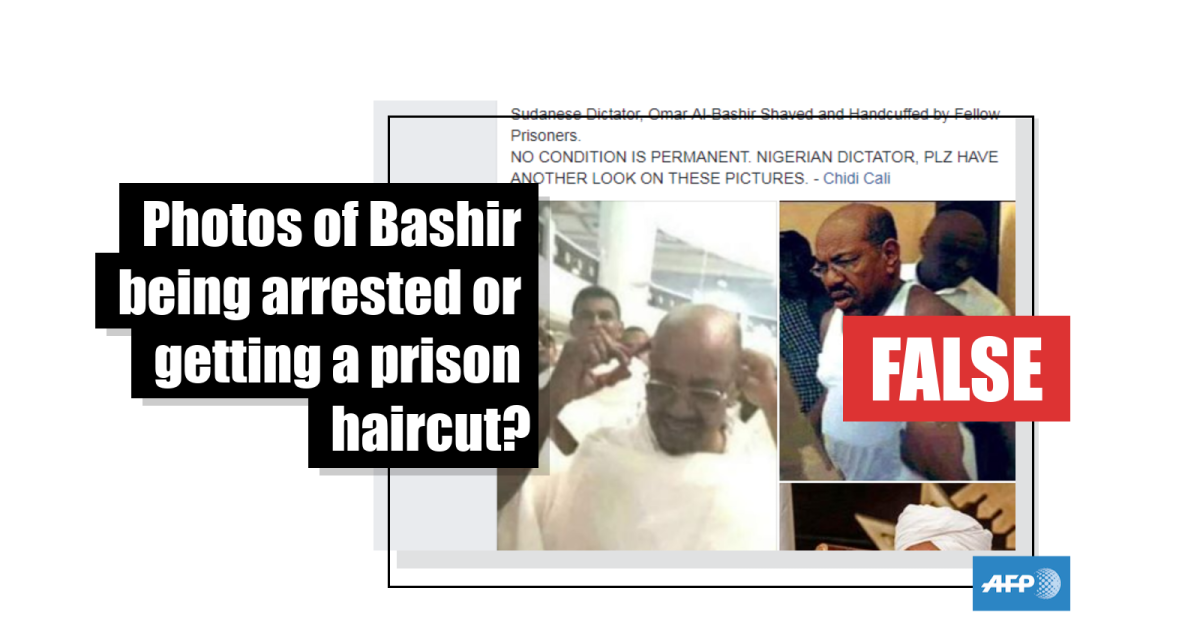 No, these photos do not show Sudan’s ex-president Omar al-Bashir being arrested or getting a haircut in prison