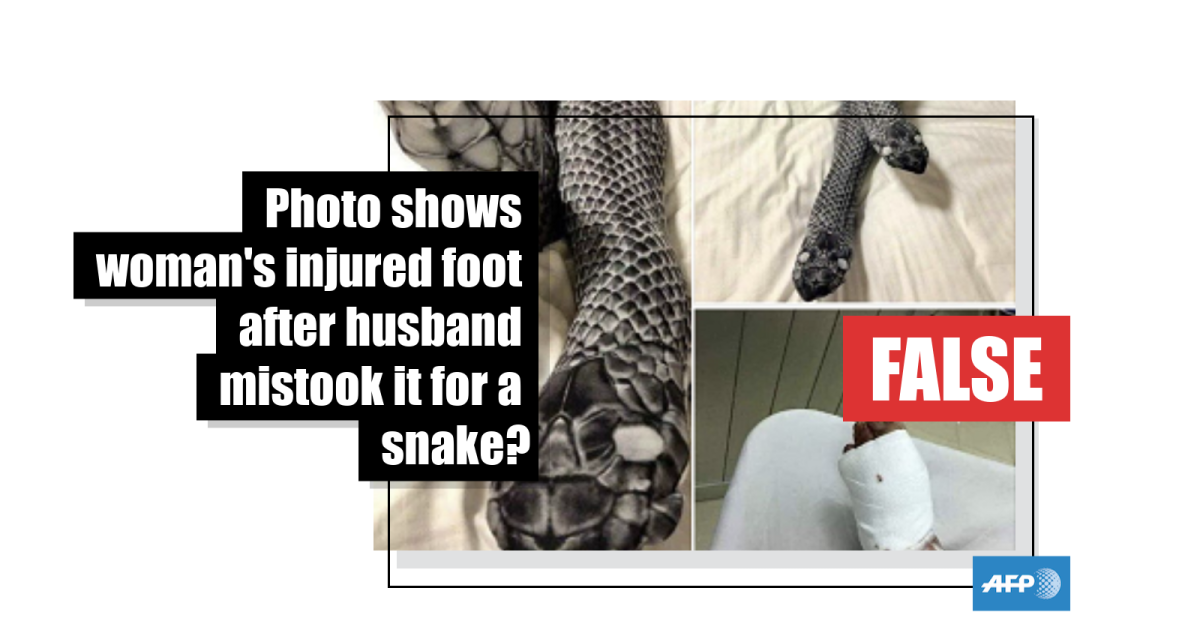 The misleading post consists of two photos of a person wearing a pair of snake print stockings, and another photo of a bandaged, bleeding foot.