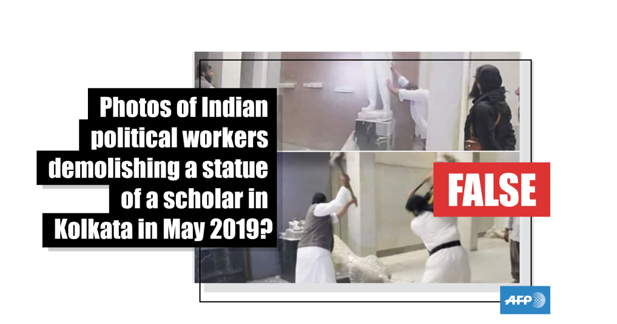 No, these photos do not show workers from the All India Trinamool Congress demolishing a statue of a scholar in Kolkata in 2019