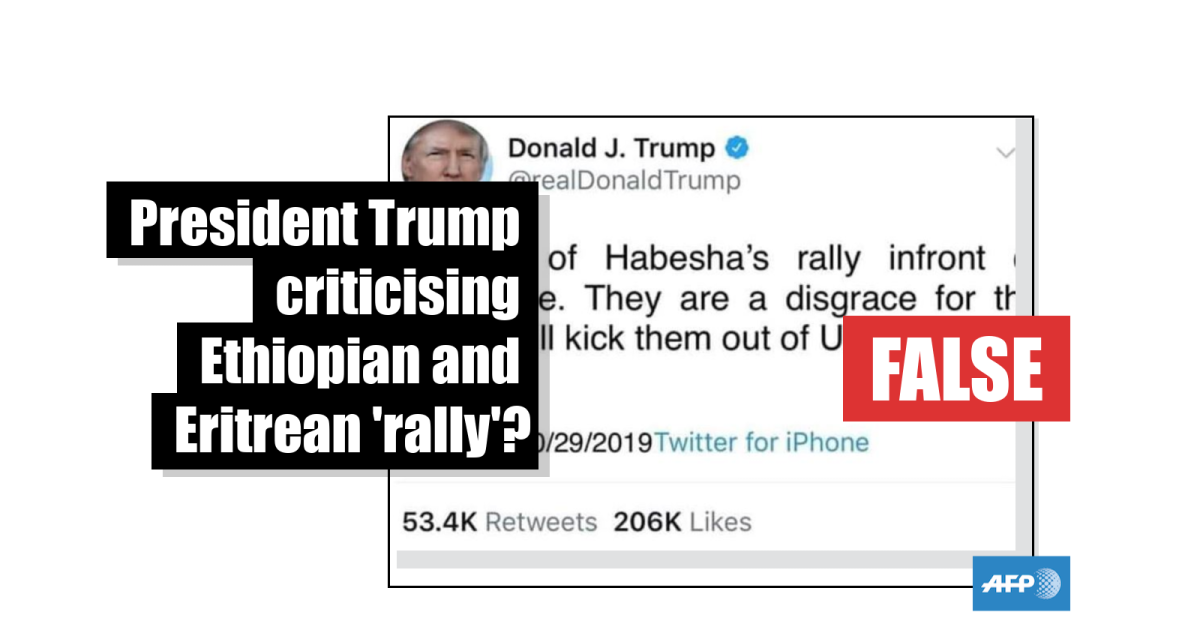 The message was supposedly also posted at the exact same time on the exact same day as another Ethiopia-related Trump tweet debunked by AFP, suggesting the same culprit is responsible.