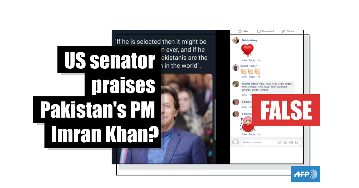 The text above the photo states: “American senator Tony Booker said: “If he is selected then it might be the best selection ever, and if he is elected then Pakistanis are the most wise nation in the world.””
