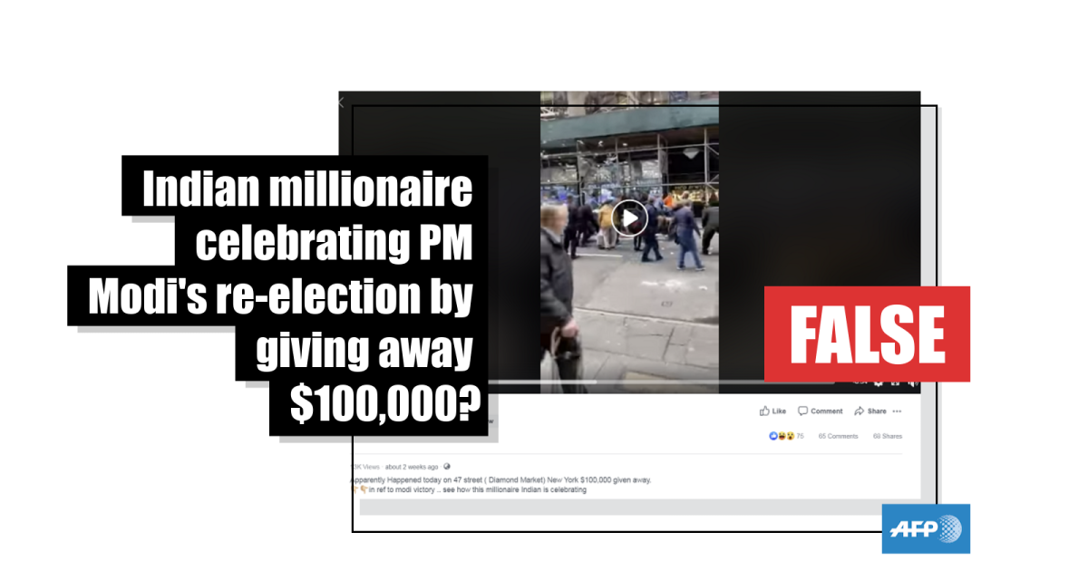 The same video was posted here, here, here and here on Facebook with a similar claim that an Indian millionaire gave money away to celebrate Modi’s victory.