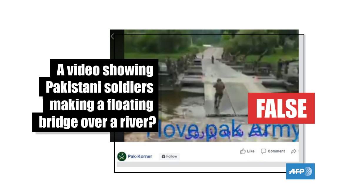 Multiple online posts contain a video showing soldiers constructing a temporary bridge over a river and military vehicles crossing it as patriotic Pakistani songs play in the background.