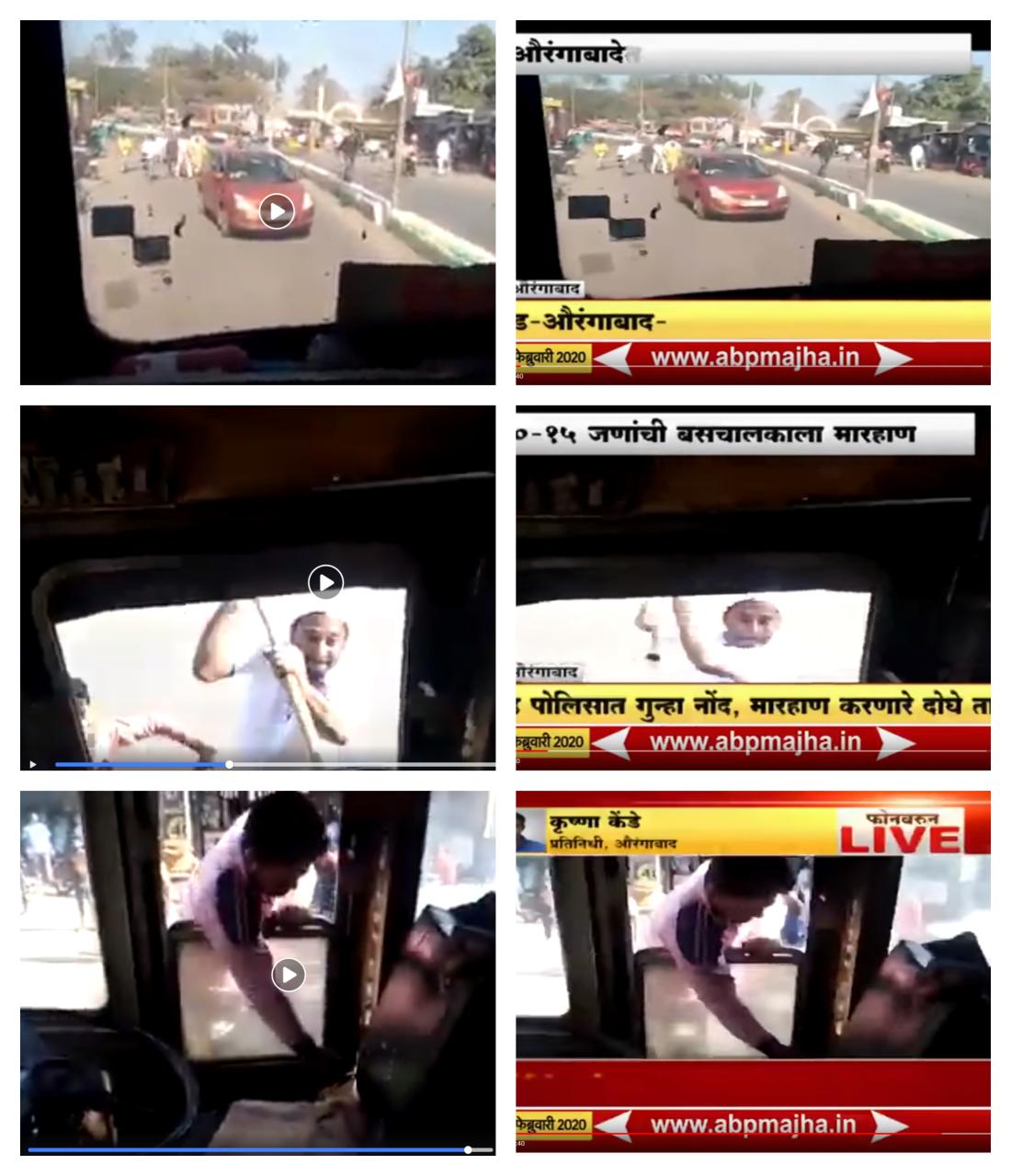 The Marathi-language video caption translates to English as: “A bus driver from Shirpur was beaten by a group of people in Kannad town of Aurangabad district because he hit a car while overtaking it. A case has been registered in the local Kannad Police Station over the brawl and more details are awaited.”
