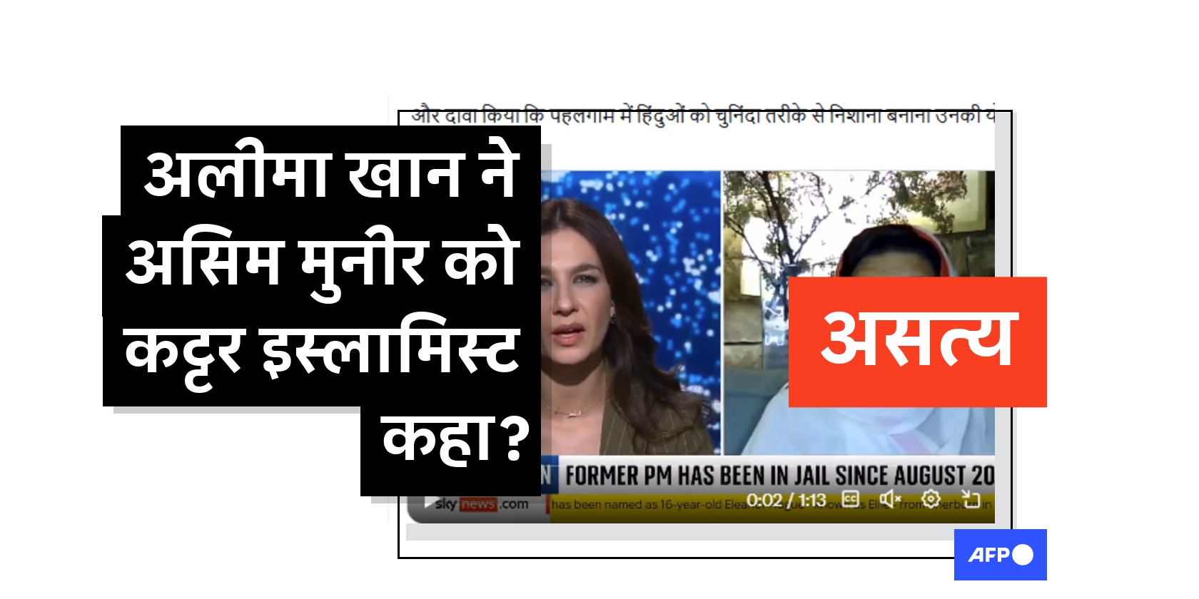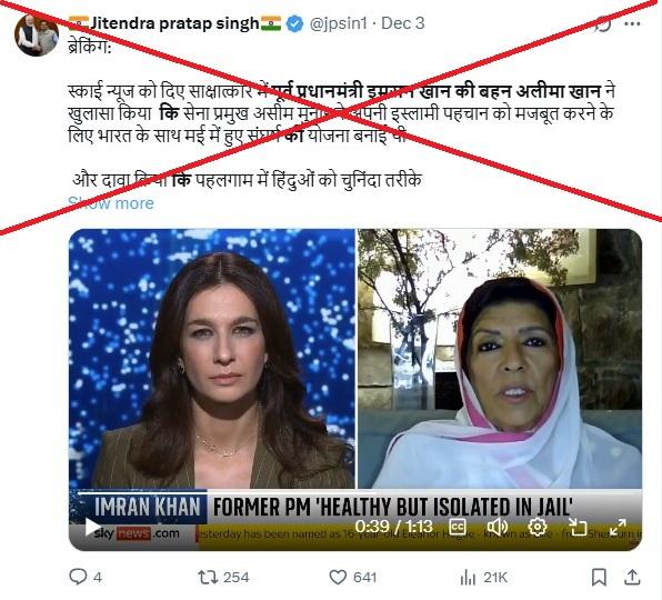 दिसंबर 3, 2025 को शेयर किए गए हिंदी भाषा के X पोस्ट में दावा किया गया कि स्काई न्यूज़ को दिए एक इंटरव्यू में पूर्व प्रधानमंत्री इमरान ख़ान की बहन अलीमा ख़ान ने आरोप लगाया कि "सेना प्रमुख आसिम मुनीर ने अपनी 'इस्लामी पहचान' मज़बूत करने के लिए मई में भारत के साथ हुए संघर्ष को बढ़ाया. पोस्ट में यह भी कहा गया कि पहलगाम में हिंदुओं को निशाना बनाया जाना इसी "साज़िश का हिस्सा था".