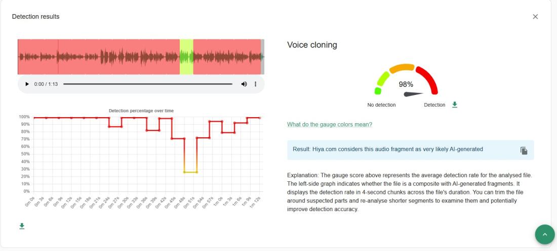 इसके अलावा, एआई वॉयस डिटेक्शन टूल Hiya से किए गए विश्लेषण में भी यह संकेत मिला कि ऑडियो के एआई से बनाए जाने की संभावना 98 प्रतिशत है.