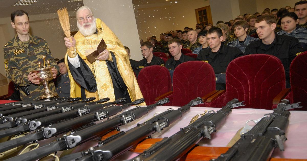 “A Russian Orthodox priest blesses new Kalashnikov machine guns during a ceremony presenting the new weapons to recently enlisted members of Russia’s elite ‘OMON’ riot police corps in Stavropol,” the caption reads.