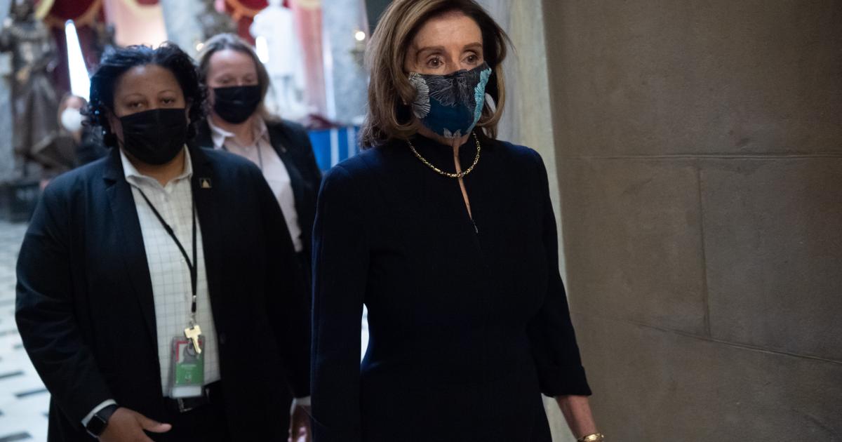 Its caption says it shows Pelosi returning to her office after opening House debate on the impeachment of then-president Donald Trump on January 13, 2021.