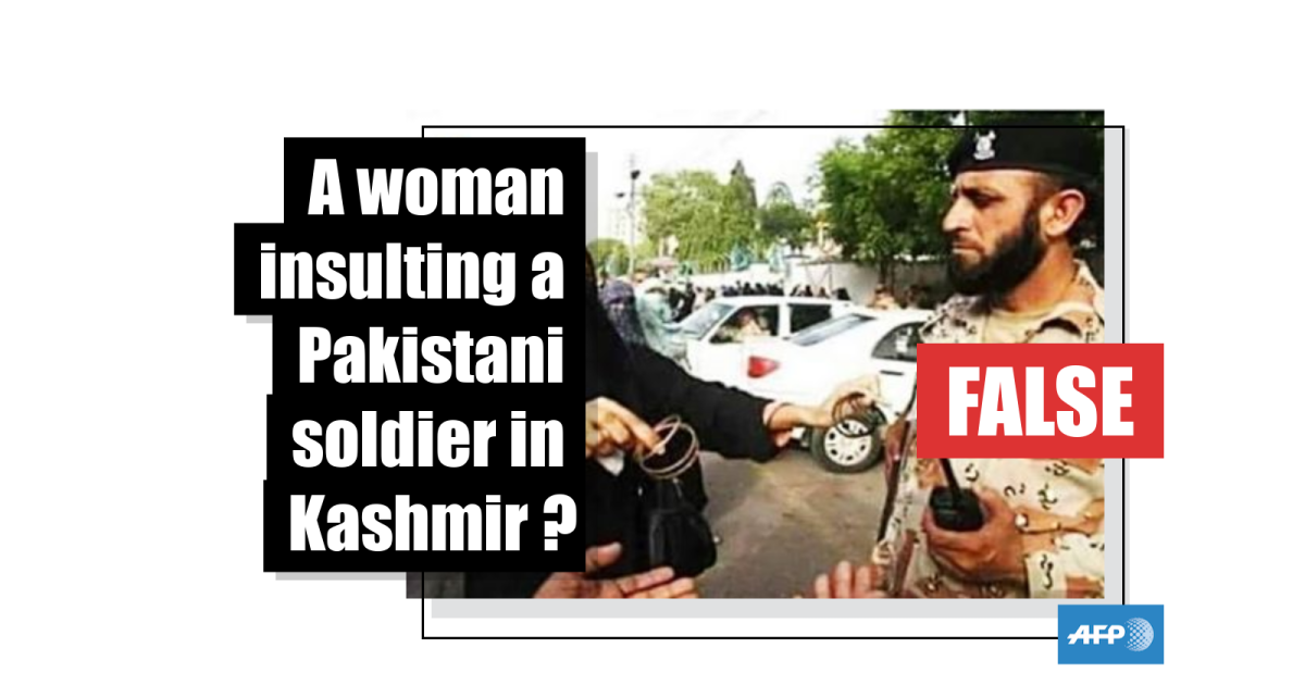 This is a photo from a 2013 protest in Karachi, not a woman insulting a Pakistani soldier in Kashmir