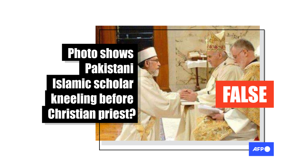The image purports to show Pakistani Islamic scholar Tahirul Qadri kneeling before a priest.