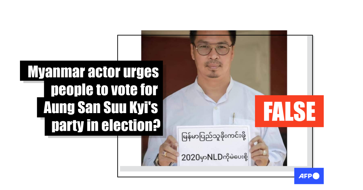 It shows Myanmar actor and director Ko Pauk holding a placard that reads; “Let’s vote for NLD to prevent thieves in Myanmar” in Burmese.