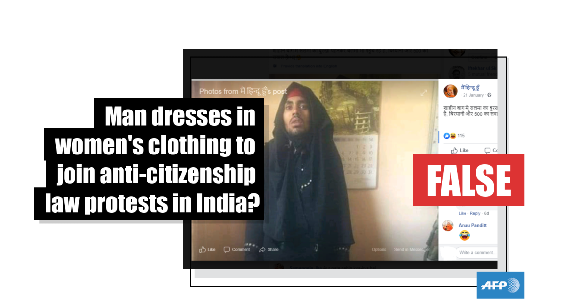 The post’s Hindi-language caption translates to English as: “In Shaheen Bagh, a man wearing a woman attire is attending the protests, as Biryani and Rs 500 is at stake.”