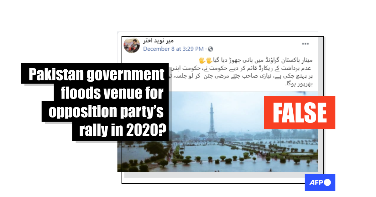 The photo was published on Facebook here on December 8, 2020. It shows flooding around Lahore’s Minar-e-Pakistan monument. The post has been shared 220 times.