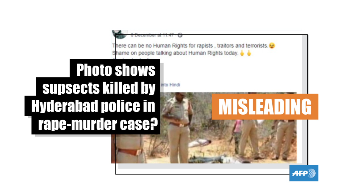 The misleading image and claim was shared on the same day that four suspects were shot dead by police in Hyderabad in the southern Indian state of Telangana after a female veterinarian was gang-raped and murdered on November 27, 2019, as reported here by AFP.