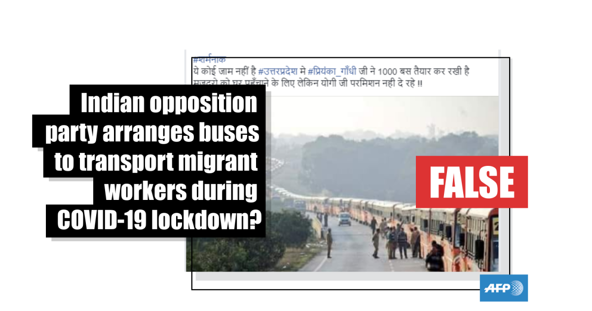 “This is true that we have sought permission from the state government to run a thousand buses, but this photo has nothing to do with our efforts to arrange buses for migrant workers,” Mohit Pandey, the INC’s head of social media in Uttar Pradesh, told AFP by phone on May 19, 2020.
