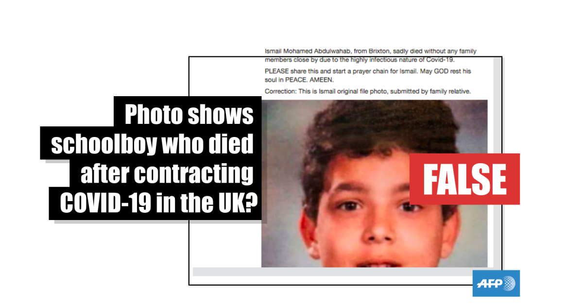 Ismail Mohamed Abdulwahab was a 13-year-old who died from COVID-19 in the UK in March 2020, as reported by AFP.