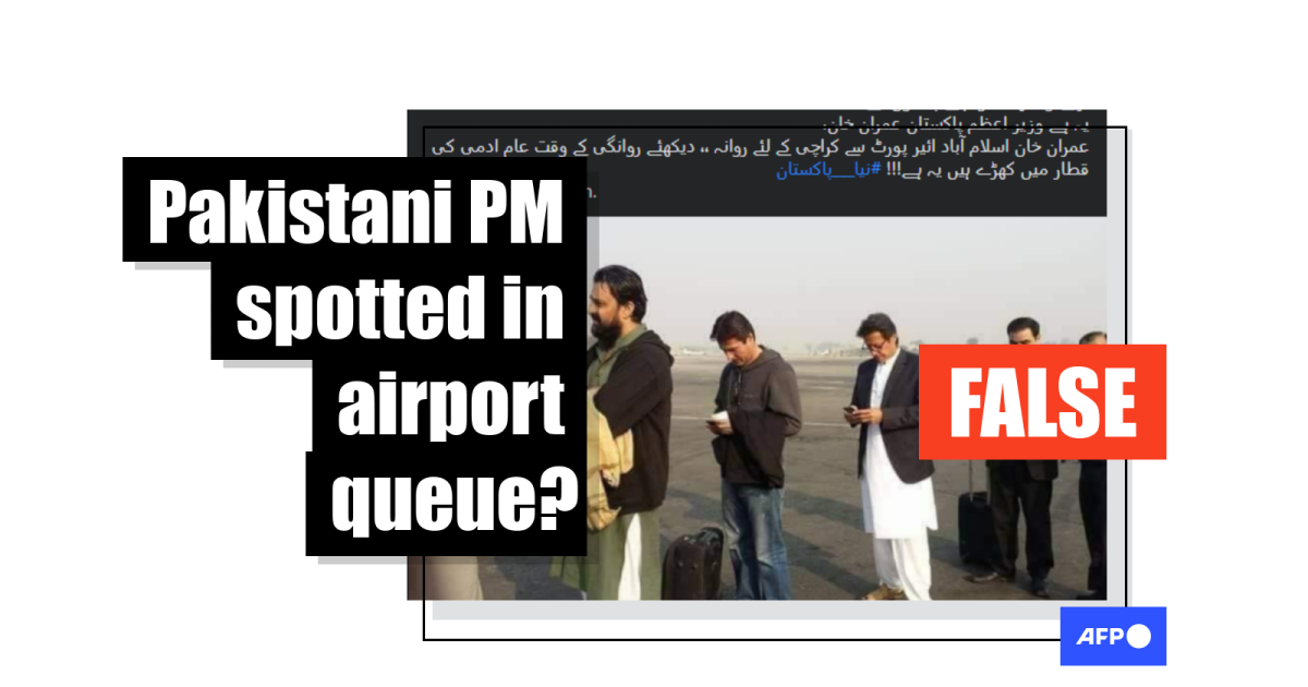 The Urdu-language caption of the post translates as: “This man standing in a queue is not Nawaz Sharif who used to book the entire plane to go to London and America with his family with public money. This is Prime Minister of Pakistan Imran Khan. Imran Khan leaves for Karachi from Islamabad airport. See he is standing in the common people’s queue at the time of departure. This is new Pakistan. Love you Imran Khan.”