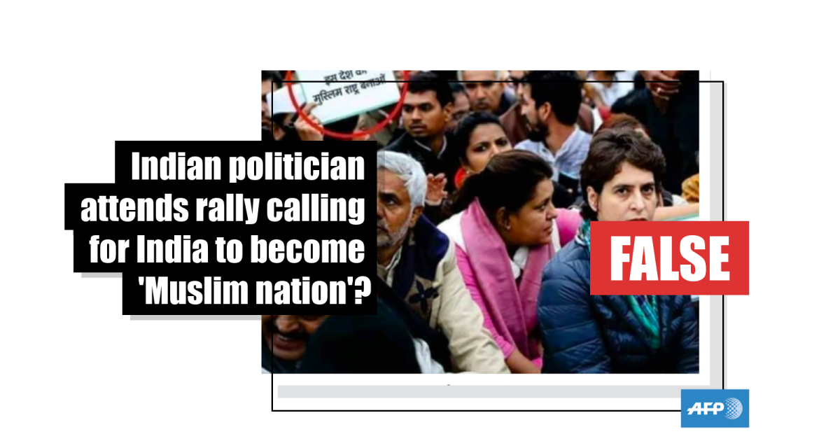 This photo of India’s Priyanka Gandhi at a rally has been doctored to include a false placard