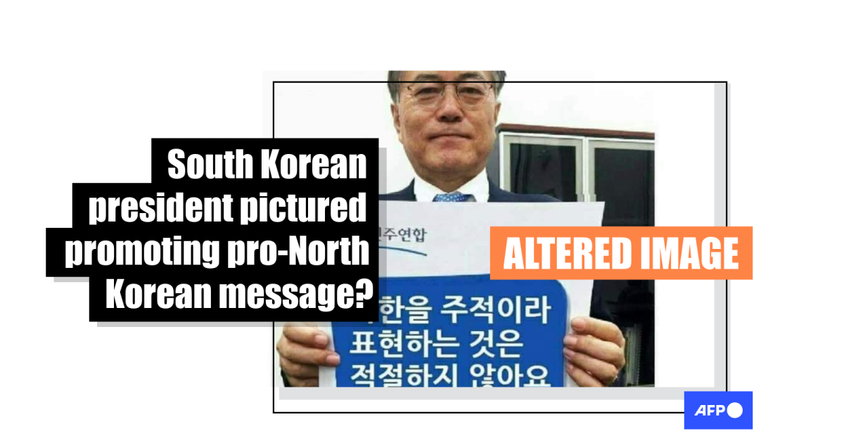 It purports to show President Moon Jae-in holding a card with Korean-language text that translates to English as: “It is inappropriate to call North Korea main enemy. It’s the country of my grandfather and my homeland.”