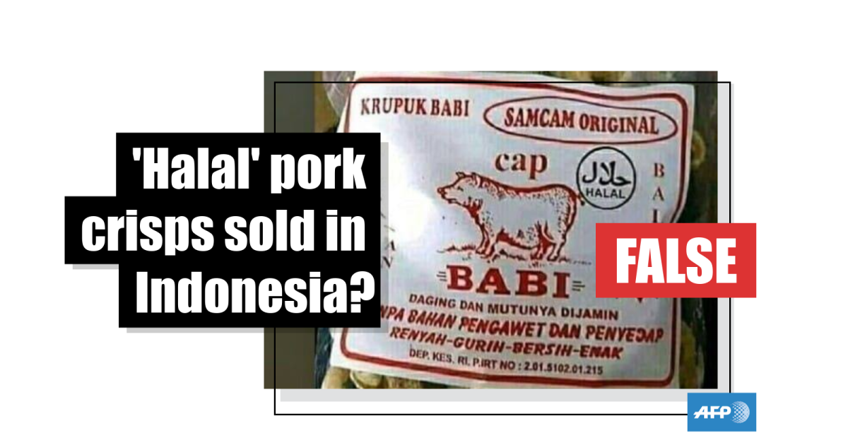 The image in the misleading posts has been doctored. A keyword search on Google found the pork crisps shown in the photo for sale in a number of online shops, for example oleholehkhasbali.com, on the Hindu-majority Indonesian resort island of Bali.