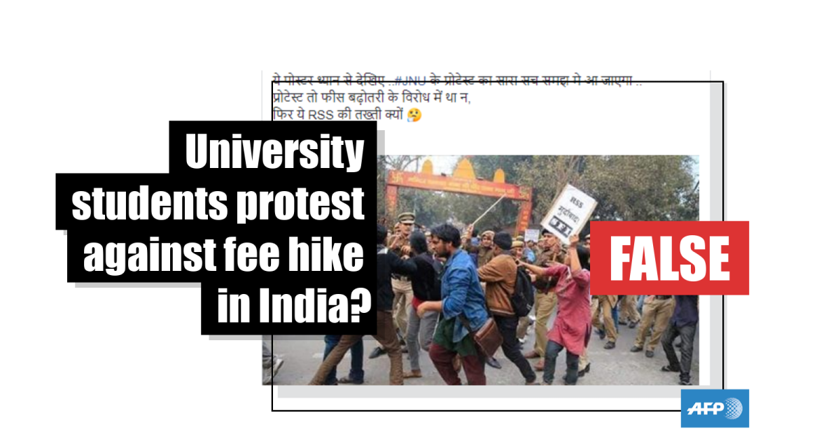 The caption uses the acronym JNU in reference to Jawaharlal Nehru University where students have been protesting against a proposed increase to various fees. Baton-wielding police responded to the unrest with a crackdown on November 19, 2019, AFP reported here.