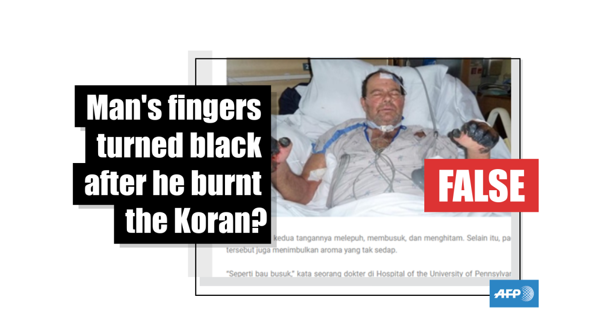 The Indonesian-language post's headline translates to English as: “After burning the Koran, this man’s fingers turned black and released disgusting odour.”