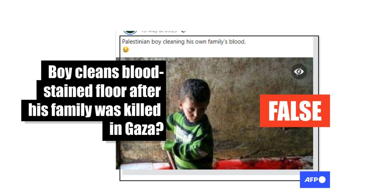 “Palestinian boy cleaning his own family's blood,” reads the Facebook post, which has been shared more than a dozen times since being published on May 15, 2021.