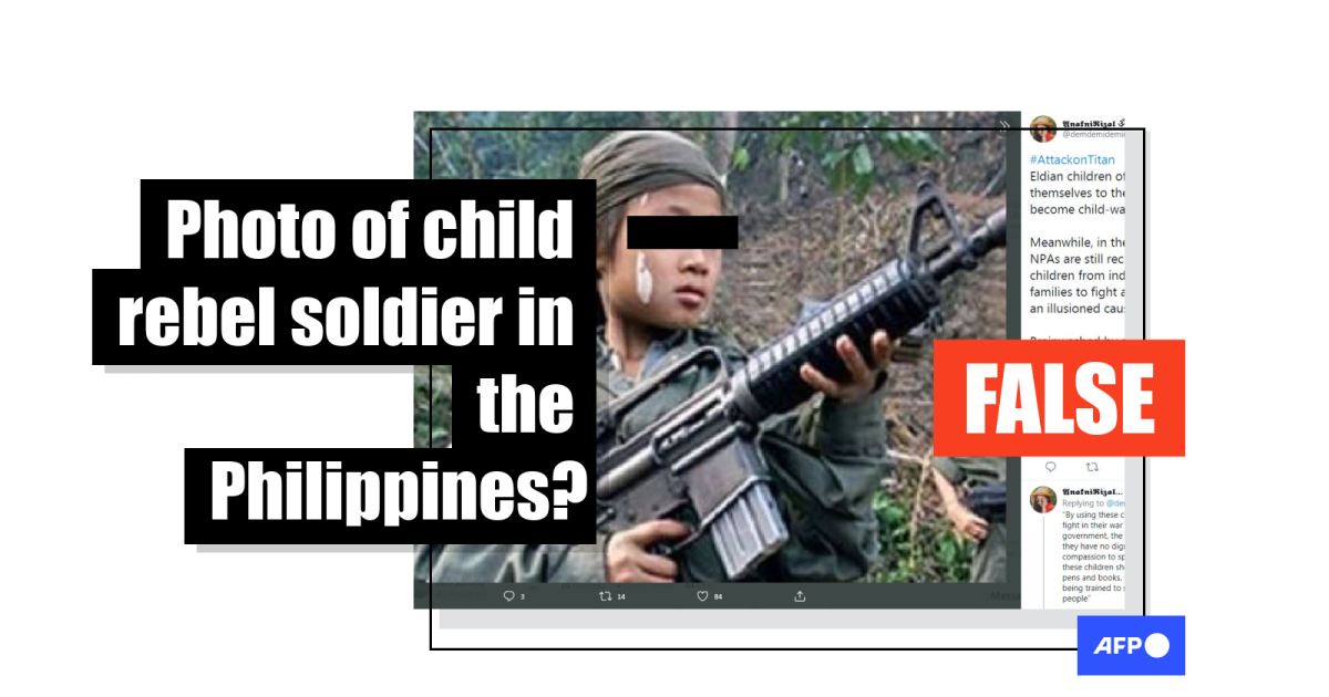The photo was shared alongside a similar claim on Twitter here; on Facebook here and here; and on YouTube here. It was also published by Philippine broadsheet Daily Tribune in a 2019 report here about NPA child soldiers.