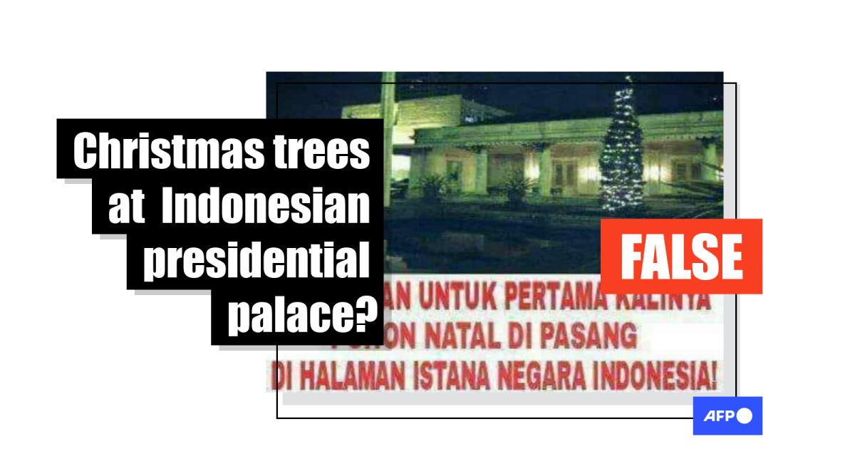 The Indonesian-laguage text on the photo translates into English as “PRAISE BE TO GOD FOR THE FIRST TIME CHRISTMAS TREES INSTALLED IN THE YARD OF INDONESIAN STATE PALACE! Since Indonesia’s Independence in 1945! JOKOWI’S government IS AMAZING.”