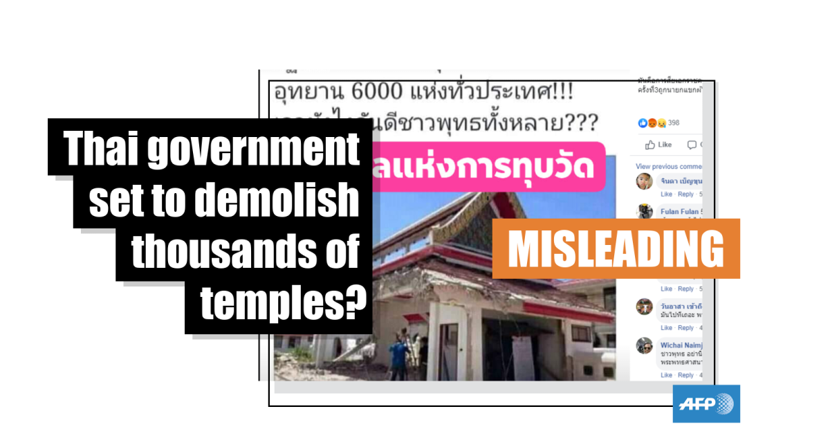 The Thai headline translates to English as: “The Government Prepares to Smash Temples in 6,000 parks around the country is fake news that has confused the general public. Do not share!”