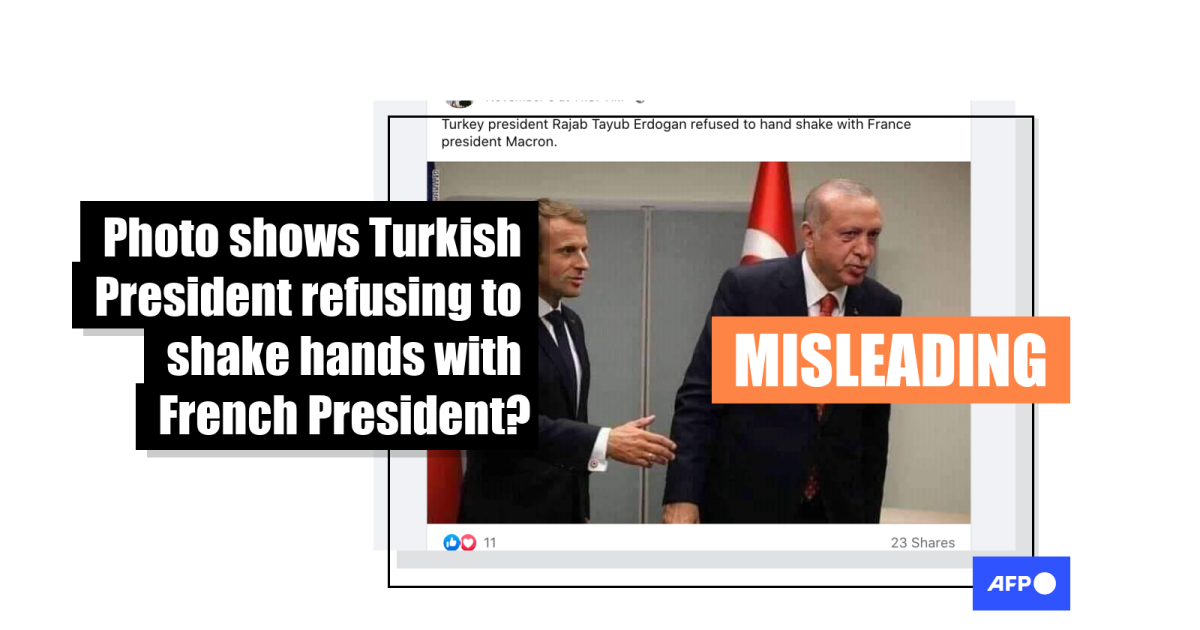 Its caption reads: “Turkey president Rajab Tayub Erdogan refused to hand shake with France president Macron."