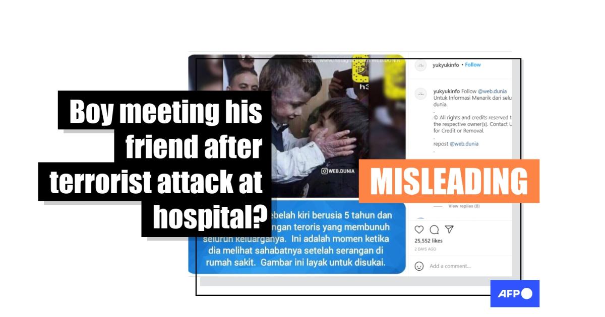 The image has an Indonesian-language text that translates to English as: “The boy on the left is 5 years old and has survived a terrorist attack that killed his family. This is the moment when he meets his best friend after an attack at a hospital. This photo deserves to be liked.”