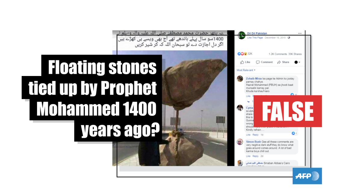 The Urdu-language caption translates to English as: “These stones were tied by prophet Mohammed Peace be Upon Him 1400 years ago, till today they are still standing the same, if your heart allows then share by saying Glory to God.”