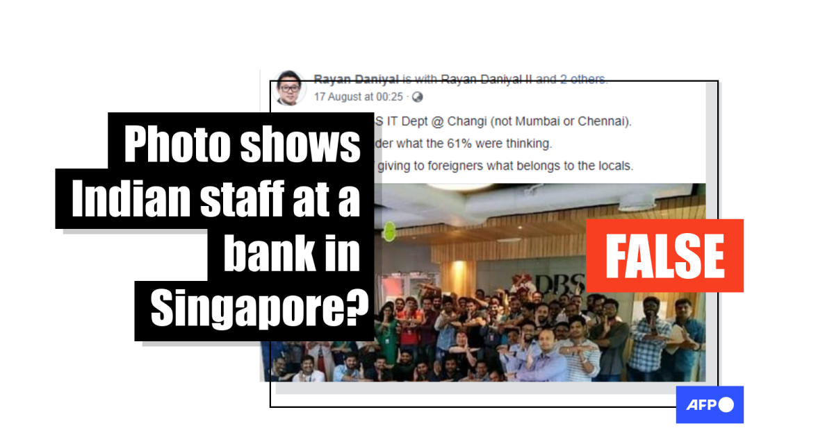 In an email to AFP on August 27, 2020, Shoma Narayanan, the head of group strategic marketing & communications at DBS Bank India, said: “The photograph was taken in the DBS Asia Hub 2, Hyderabad...around a year ago, at an internal conference”.