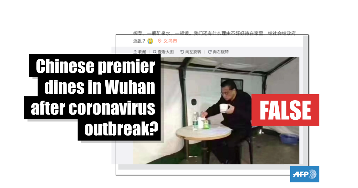 The simplified Chinese language caption translates to English as: “This is our premier in the infected area in Wuhan, having a bowl of rice, a packet of pickles and a bottle of mineral water for a meal. What reason do we have to not stay home and avoid adding trouble to our government and society?”
