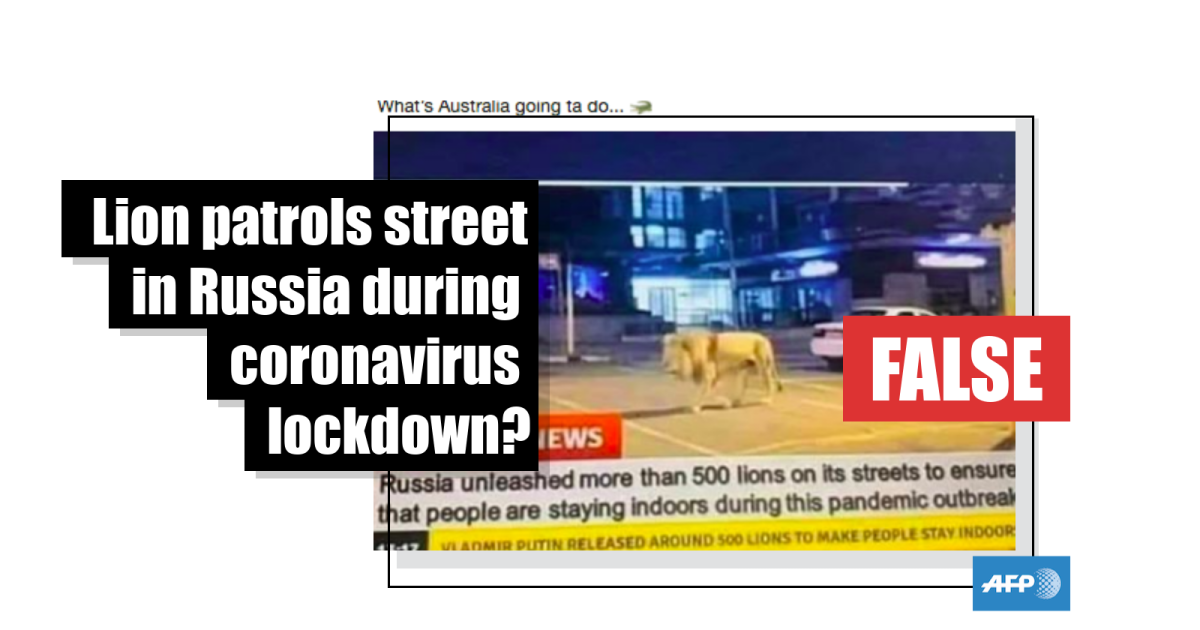 The post’s caption states: “What’s Australia going ta do…”; the text on the purported chyron reads: “Russia unleashed more than 500 lions on its streets to ensure that people are staying indoors during the pandemic outbreak”.