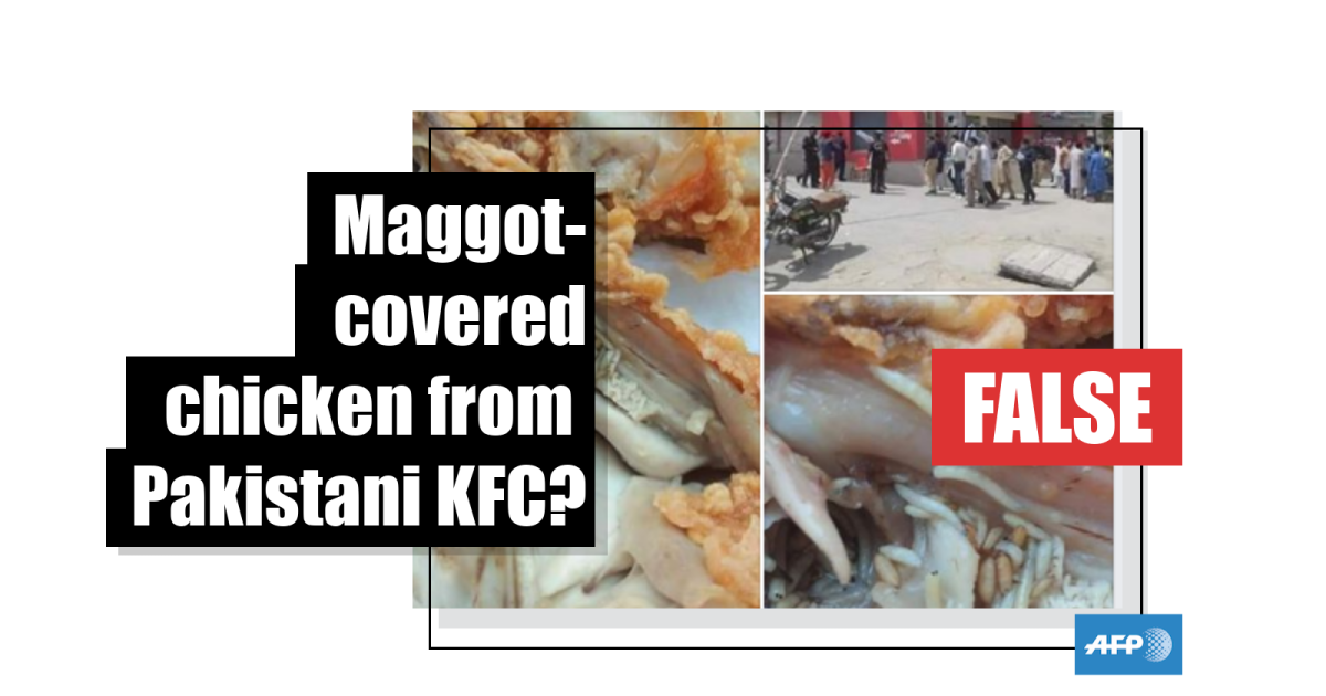 This Facebook post, which has been shared some 1,100 times since it was published on June 28, 2019, contains an image of a KFC restaurant in Larkana, Pakistan and two photos of fried chicken covered with maggots.