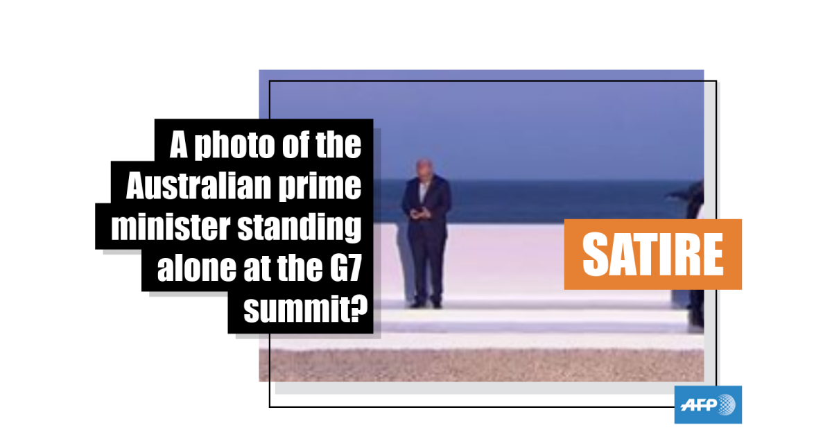 The image, for example here on Facebook on August 26, 2019, purports to show Morrison standing alone and at a considerable distance away from a other world leaders at the G7 meeting in the French city of Biarritz.