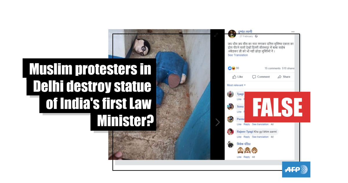 The post's Hindi-language caption translates to English as: “Those who shout the slogans of ‘Jai Bhim and Jai Meem’ to show unity between Muslims and lower caste Hindus, they have broken the statue of Dr Ambedkar in violence in Delhi’s Seelampur locality.”