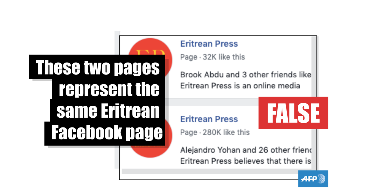 The editor of The Eritrean Press who goes by “Mr. J”, told AFP that the mistake on their handle name had been a simple typo, and Facebook had not allowed them to change it. The typo also means the fake account appears higher up in searches.